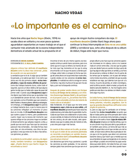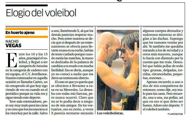 En cualquier caso, Nacho García Vegas se ha ocupado de crear un Nacho Vegas bisexual sin ceremonia. Por un lado hemos podido seguir por la «prensa rosa musical» sus relaciones con mujeres (como Beatriz Concepción de Nosotrash o Cristina Rosenvinge) y por otro lado nos ha regalado canciones, algunas entrevistas y artículos como el que firmó en Público sobre ¿su? relación con el voleibol y del que tenéis una captura a continuación.
